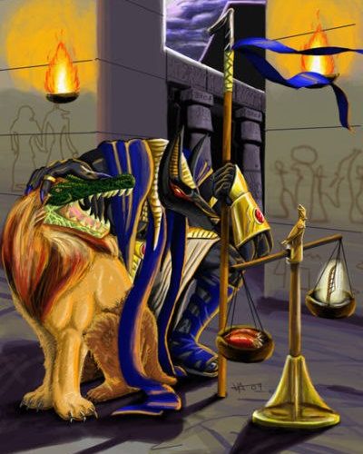 Diriler ve ölüler ülkesi arasındaki korku ülkesini geçince, büyük yargıcın karşısına, Anubis veya Horus tarafından getirilirdi. Orada bir tören düzenleniyor, bu törende ölenin kalbi tartılıyordu. Bu tören sırasında yeraltı tanrısı Anubis elinde bir terazi tutardı. Ölünün kalbi bu terazinin kefelerinden birine konurdu. Öteki kefede ise adaleti ve doğruluğu ölçebilecek bir tüy bulunurdu. Eğer ölü adil ve dürüst bir yaşam sürmüş ise kefeler dengelenirdi. Eğer kalp tartıda eksik gelirse, yemesi için Ament adlı canavara verilirdi. Bütün bu olup biteni Tanrıların katibi Thoth kayda geçirirdi.